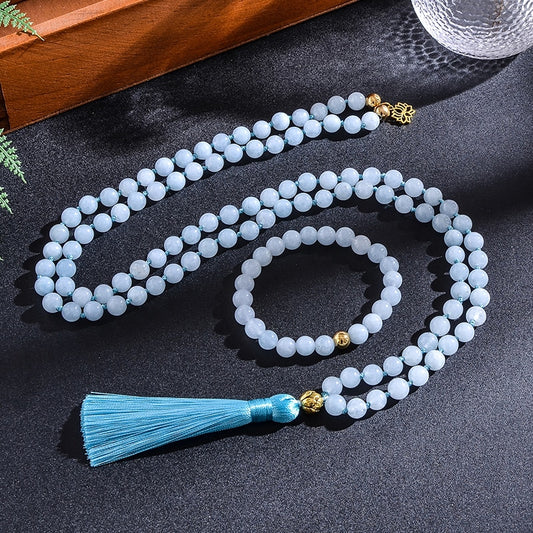 Conjunto japamala e pulseira 108 contas 8mm com Agua-marinha com pingente Flor de lotus